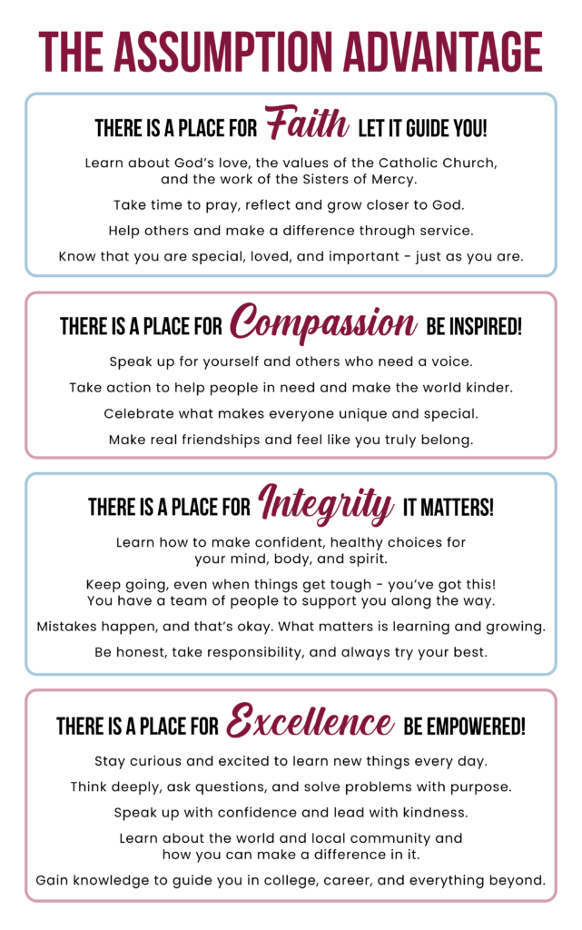 Over the course of the last 70 years, generations of faculty and staff have worked tirelessly to achieve our school’s vision to graduate young women who are socially responsible, committed to gospel living, lifelong learning, and a life of leadership and service. One of the objectives of our 2015-2020 strategic plan, however, was for our faculty and staff to crystallize that vision and define Outcomes of an Assumption Education. Over the course of the 2018-2019 school year, the faculty and staff worked together to collectively determine a list of skills that we were committed to ensuring every student at Assumption would learn before she graduated. These outcomes were built on the four pillars of our mission statement – faith guides, compassion inspires, integrity matters, and excellence empowers – and designed to allow students to become the best version of themselves. Since that time, they have been at the forefront of every decision we have made in regard to our academic curriculum and co-curricular programming.