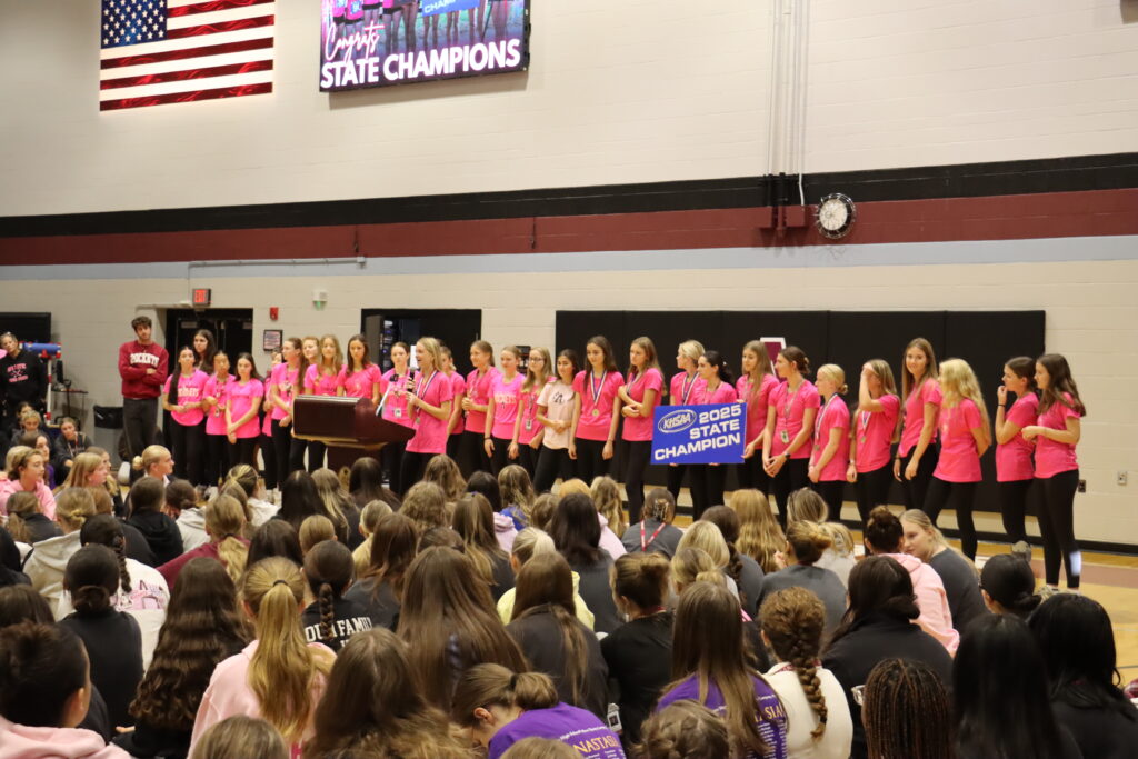 - The Cross Country team for winning the state championship. This is the team’s third consecutive state championship and tenth in school history. Congratulations to Mabel George, Caitlin Perkins, Taylor Mills, Maura Ferguson, Kinsley Yaden, Taryn Tracy, and Ella Spalding for running in the meet.